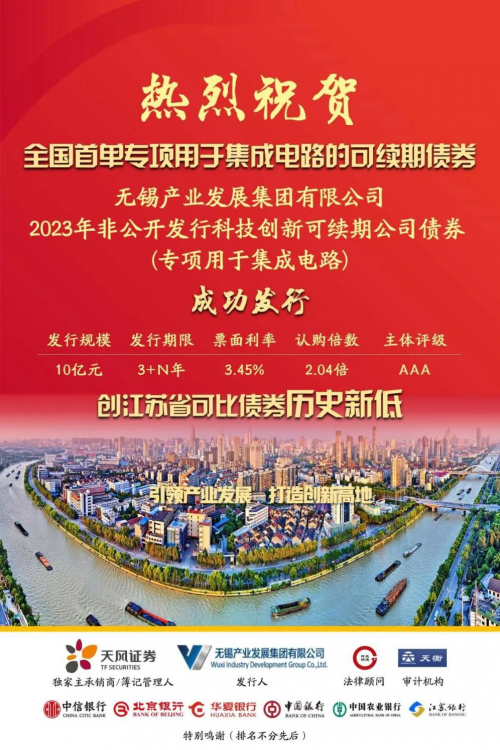 近期,无锡产业发展集团科创可续期债券“23锡YK01”以10亿元的发行规模、3+N年的发行期限在上海证券交易所顺利发行,其票面利率仅为3.45%,是全国首单专项用于集成电路的可续期债券,由天风证券作为主承销商和簿记管理人。该债券的成功发行对科技创新升级,促进先进制造的发展具有重要的现实实践意义,起到了示范性的作用,备受金融市场的重视和认可。