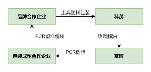 科茂通过化学回收装置将生活垃圾中的废塑料包装转化为热裂解油(COMY Oil)等基础化学品,再由京博石化和京博聚烯烃加工成原生品质PCR(消费后回收)聚丙烯塑料,最后由包装企业加工成全新的塑料包装,从而完成“生活废塑料到食品级新塑料”原级回收产业链闭环。该过程遵循“质量平衡”法,产出的新塑料包装与石油基塑料包装品质一致。